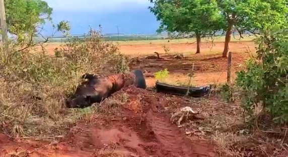 As imagens mostram duas cabeças de gado - supostamente atingidas por raio (conforme relato do denunciante), sendo descartadas às margens da rodovia.