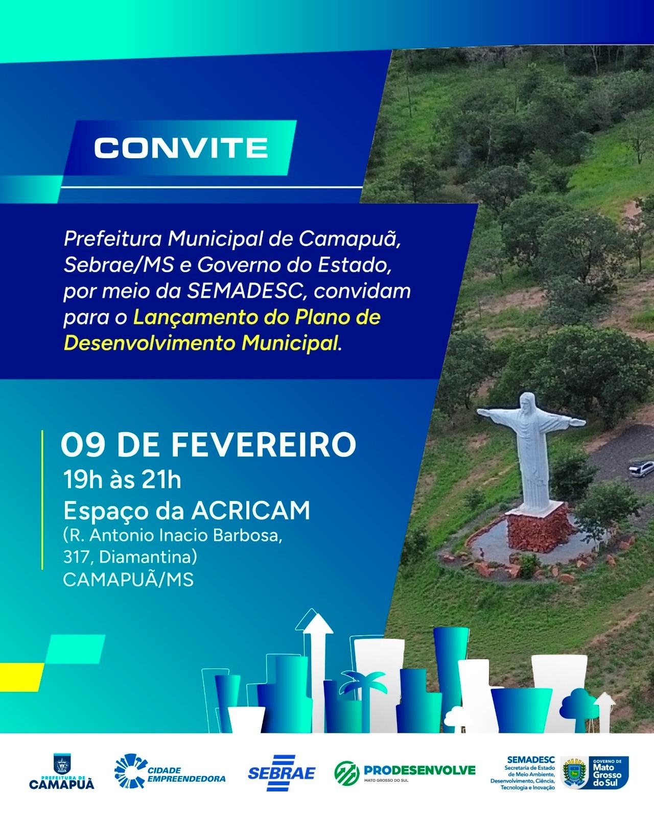 A Prefeitura Municipal de Camapuã, em parceria com o Sebrae/MS e o Governo do Estado de Mato Grosso do Sul, por meio da Semadesc, convida a população para participar do lançamento oficial do Plano de Desenvolvimento Municipal (PDM), uma iniciativa estratégica do Programa Cidade Empreendedora.