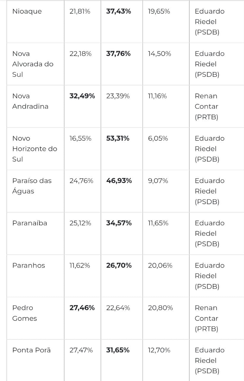 Garantido no segundo turno, Eduardo Riedel (PSDB) foi o candidato mais votado em 51 das 79 cidades de Mato Grosso do Sul. Já Renan Contar (PRTB), mesmo somando a maior quantidade de votos, liderou em apenas 18 municípios.