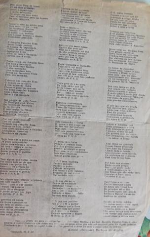 “Eu sempre gostei de guardar esses materiais! Olha, tem esse aqui que ganhei do Senhor Airton do Valle, que é muito bom, é uma lista de poemas políticos da cidade, do Estado e do Brasil, escritos por Manoel Alexandre Barbosa de Aladim. O Sr. Airton, conhecedor do meu gosto pela história, me presenteou há muito tempo com essa publicação”!