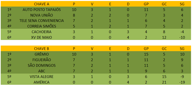 No grupo A estão com a vaga assegurada as equipes Auto Posto Tapajós, Tele Sena e Nova União, Correia Simões e Cachoeira decidem quem avançará em confronto direto na última rodada, o empate favorece o Correia.