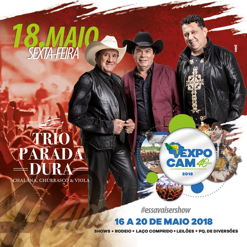 A ACRICAM (Associação dos Criadores de Camapuã-MS) divulgou nesta segunda-feira (2) a primeira atração confirmada para a 40ª edição da Expocam (Exposição Agropecuária de Camapuã), Trio Parada Dura, reconhecidos na música sertaneja por acumular fãs de várias gerações e canções que se tornaram ‘hinos’ da música sertaneja, se apresentarão no dia 18 de maio (sexta-feira).