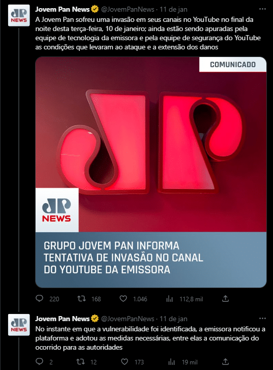 “O Grupo Jovem Pan sofreu uma invasão em seus canais no YouTube no final da noite de terça-feira.