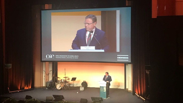 O ministro da Agricultura, Blairo Maggi, discursa durante sessão da OIE, em Paris (Foto: Ministério da Agricultura)