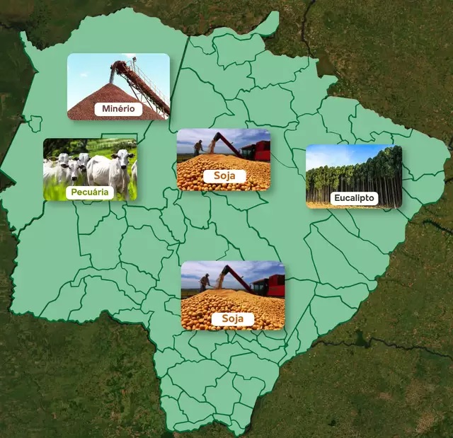 Minério, pecuária, soja, eucalipto: a produção em Mato Grosso do Sul. (Arte: Campo Grande News)