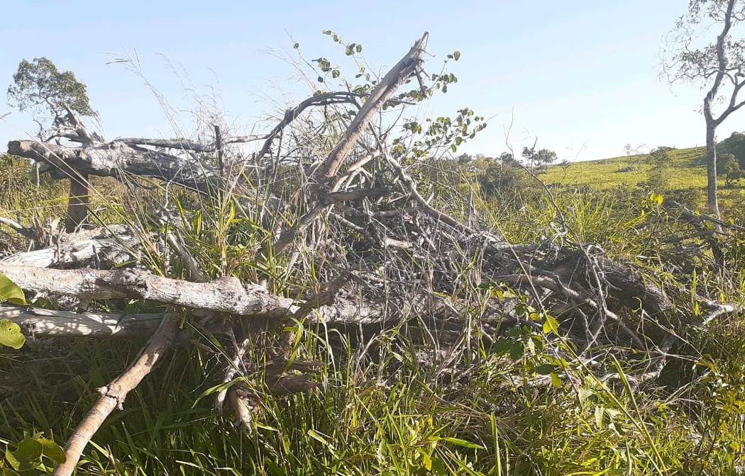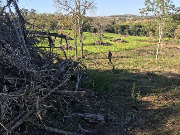 O desmatamento ocorrera entre os anos de 2016 e 2017 e a área já estava com plantio de pastagem e criação de gado bovino. Parte da madeira proveniente da vegetação desmatada estava disposta em leiras no local.