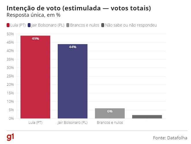 Pesquisa Datafolha divulgada nesta sexta-feira (7), encomendada pela Globo e pela "Folha de S.Paulo", aponta que o ex-presidente Luiz Inácio Lula da Silva (PT) tem 49% de intenção de votos no segundo turno e que o presidente Jair Bolsonaro (PL) tem 44%. Este é o primeiro levantamento do instituto feito após o primeiro turno das eleições.