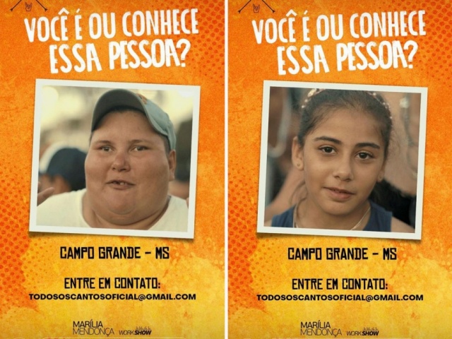 A cantora Marília Mendonça procura duas pessoas de Campo Grande que participaram de seu show no Parque das Nações Indígenas, em dezembro de 2018. As fotografias dos “procurados” foram publicadas hoje no Instagram do projeto “Te Vejo Em Todos Os Cantos”.