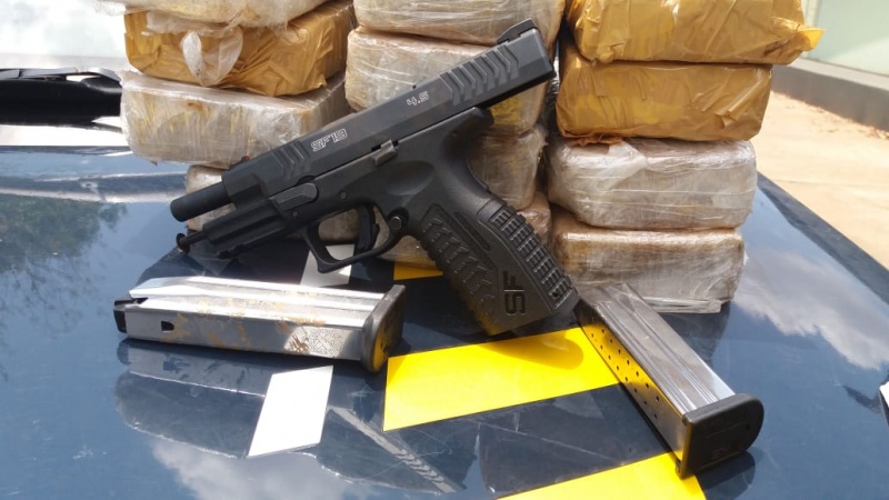 Durante vistoria no veículo, a equipe encontrou um compartimento oculto, onde estavam escondidos 13,6 Kg de pasta-base de cocaína, 7,9 Kg de maconha e uma pistola calibre 9mm.