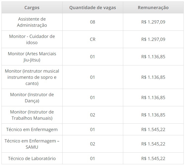 As vagas compreendem todos os níveis de escolaridade e tipos de profissionais, como professores, médicos, auxiliares e outros profissionais, com salários que podem chegar a R$ 26,3 mil.