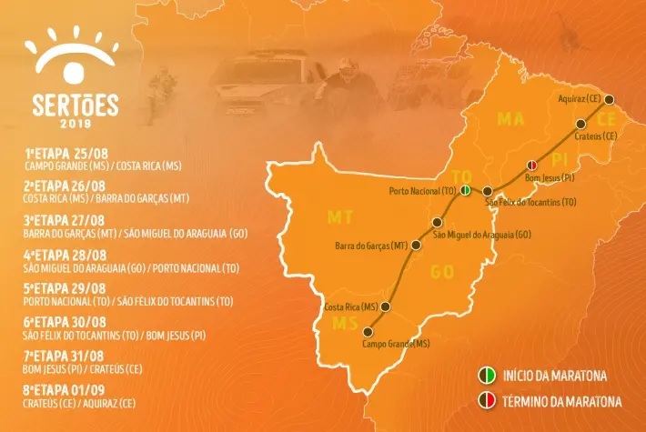 O Rally dos Sertões 2019 terá cerca de 3.500 quilômetros e vai percorrer vários estados até a chegada.