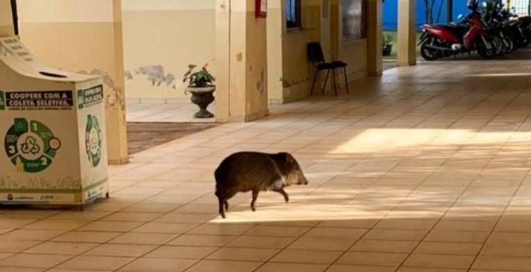 Equipe da Polícia Militar Ambiental (PMA) capturou um animal silvestre da espécie Pecari tajacu, conhecido como cateto, que apareceu passeando pelos corredores do prédio da Prefeitura Municipal de São Gabriel do Oeste, na manhã desta terça-feira (31).