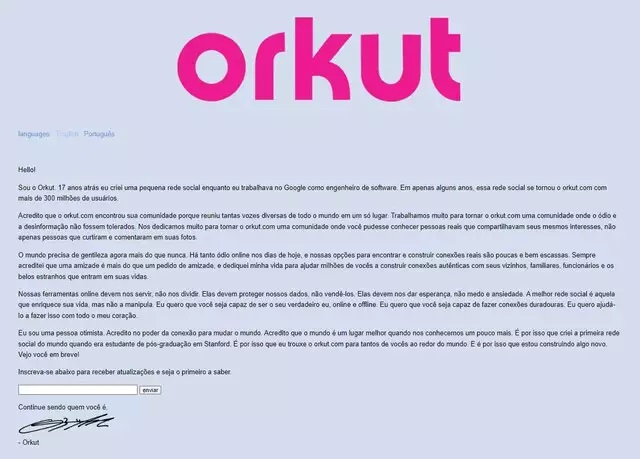 Criado em 2004 e desativado em 2014, o Orkut surpreendeu os antigos seguidores nesta quinta-feira (28). Na manhã de hoje, os responsáveis reativaram publicaram texto assinado pelo seu fundador, o engenheiro turco Orkut Buyukkokten. No antigo endereço, o www.orkut.com, o comunicado avisa que a equipe voltará, mas de cara nova e deixa espaço para o cadastramento de pessoas interessadas em saber o passo a passo dessa retomada.